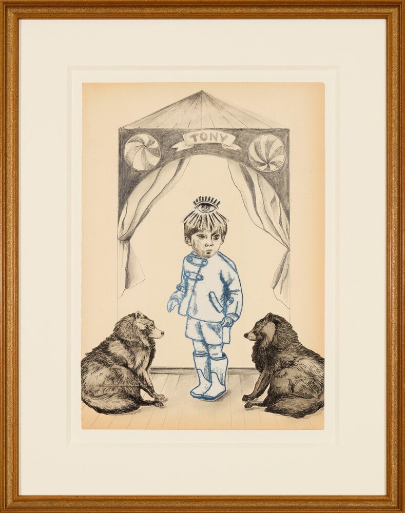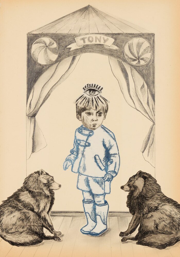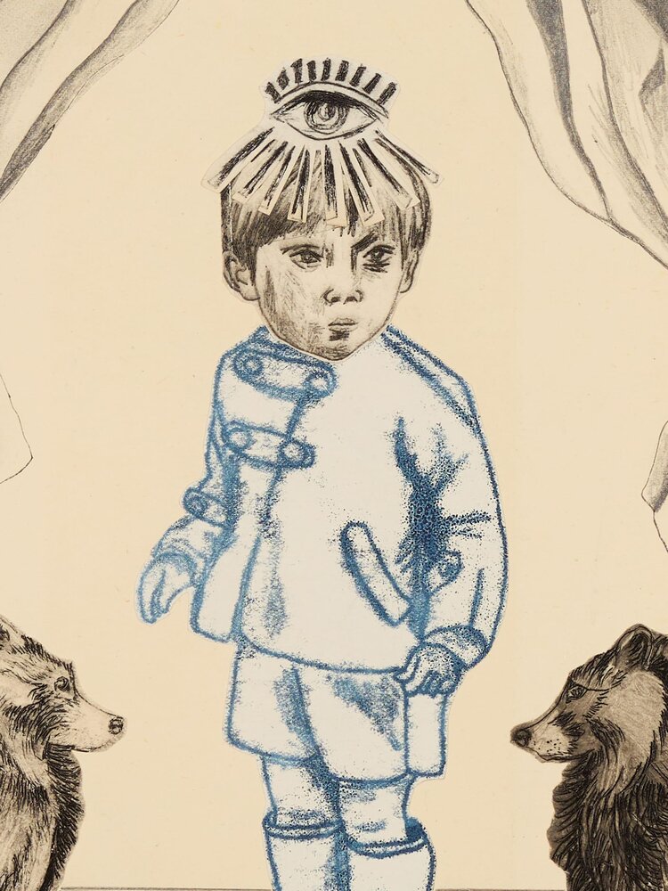 Belgium (1968)Through her often somewhat absurd collages, Kristel Naessens (b.1968, lives and works in Belgium) takes her viewers into a dreamy world. Guided by her intuition, she combines her detailed illustrations in ink or graphite pencil with graphic printing techniques such as linocuts, monotypes or the drypoint technique. In that process, technicality and craftsmanship, or being hands-on and creating imaginary worlds go hand in hand. From her love of melancholy and the fragility of old documents, she likes to work on paper from old books or magazines. Although she wants to give the viewer the freedom to create their own story, thematic threads that recur include children or man's hierarchical relationship to the planet. The ambiguous figures between humans and animals make the seemingly lovely scenes feel uncomfortable and alienating at the same time.