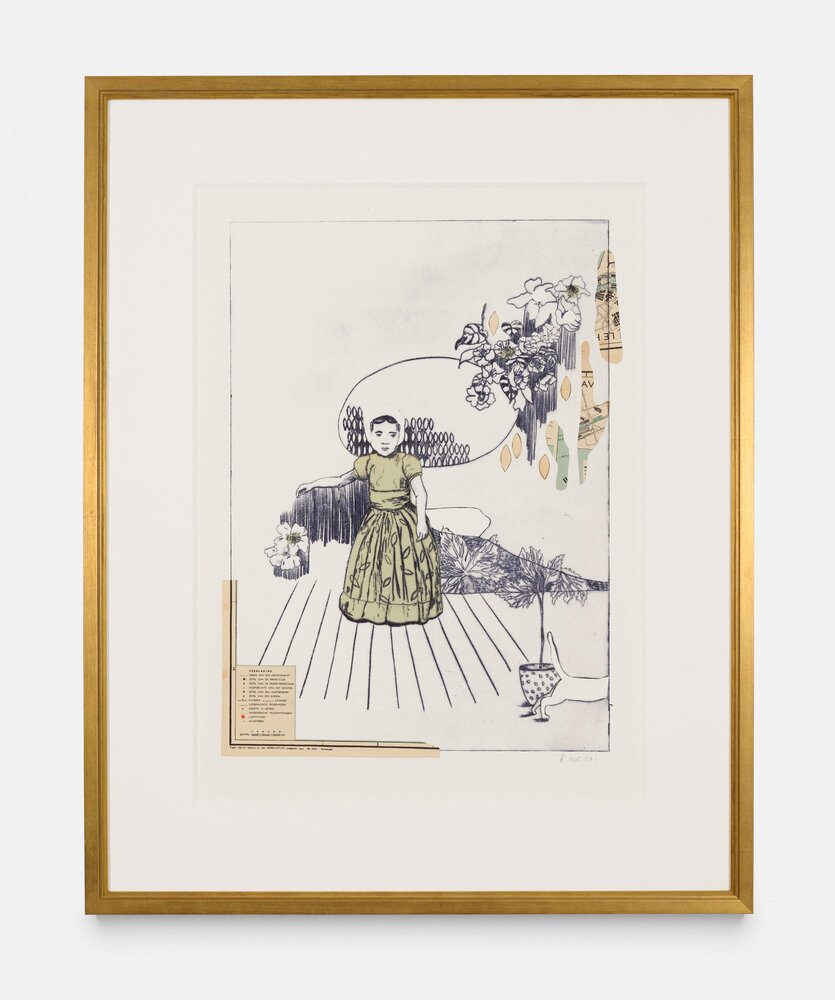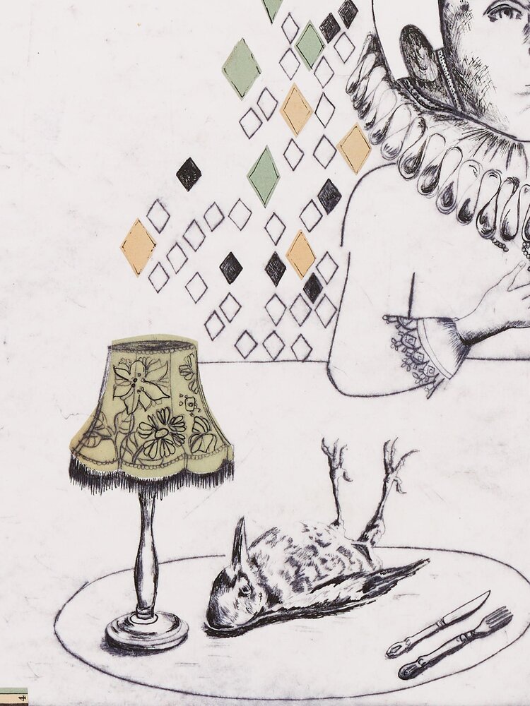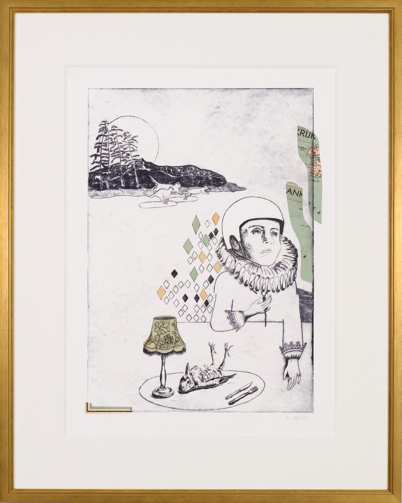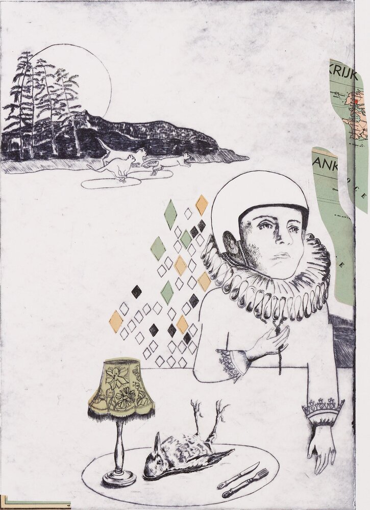 Belgium (1968)Through her often somewhat absurd collages, Kristel Naessens (b.1968, lives and works in Belgium) takes her viewers into a dreamy world. Guided by her intuition, she combines her detailed illustrations in ink or graphite pencil with graphic printing techniques such as linocuts, monotypes or the drypoint technique. In that process, technicality and craftsmanship, or being hands-on and creating imaginary worlds go hand in hand. From her love of melancholy and the fragility of old documents, she likes to work on paper from old books or magazines. Although she wants to give the viewer the freedom to create their own story, thematic threads that recur include children or man's hierarchical relationship to the planet. The ambiguous figures between humans and animals make the seemingly lovely scenes feel uncomfortable and alienating at the same time.