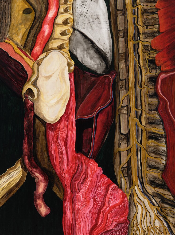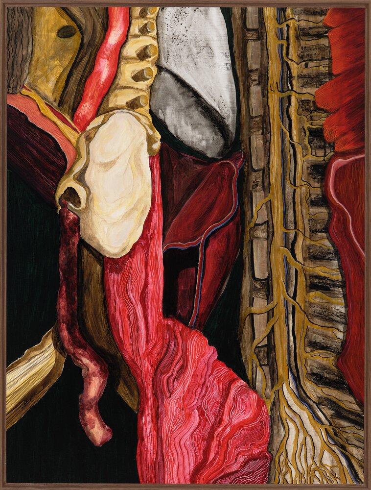 Color plays a crucial role in her work. Her palette doesn’t simply seek attention; it demands it. Bold, unapologetic, and immersive, her use of color becomes a voice of its own. Her practice often draws on personal experiences and bodily discomforts, such as in her project “Growing New Skin”, which investigates the body as a site of unease and alienation. Born from emotional and physical tension, this series portrays healing as an ongoing wound—raw yet regenerative.